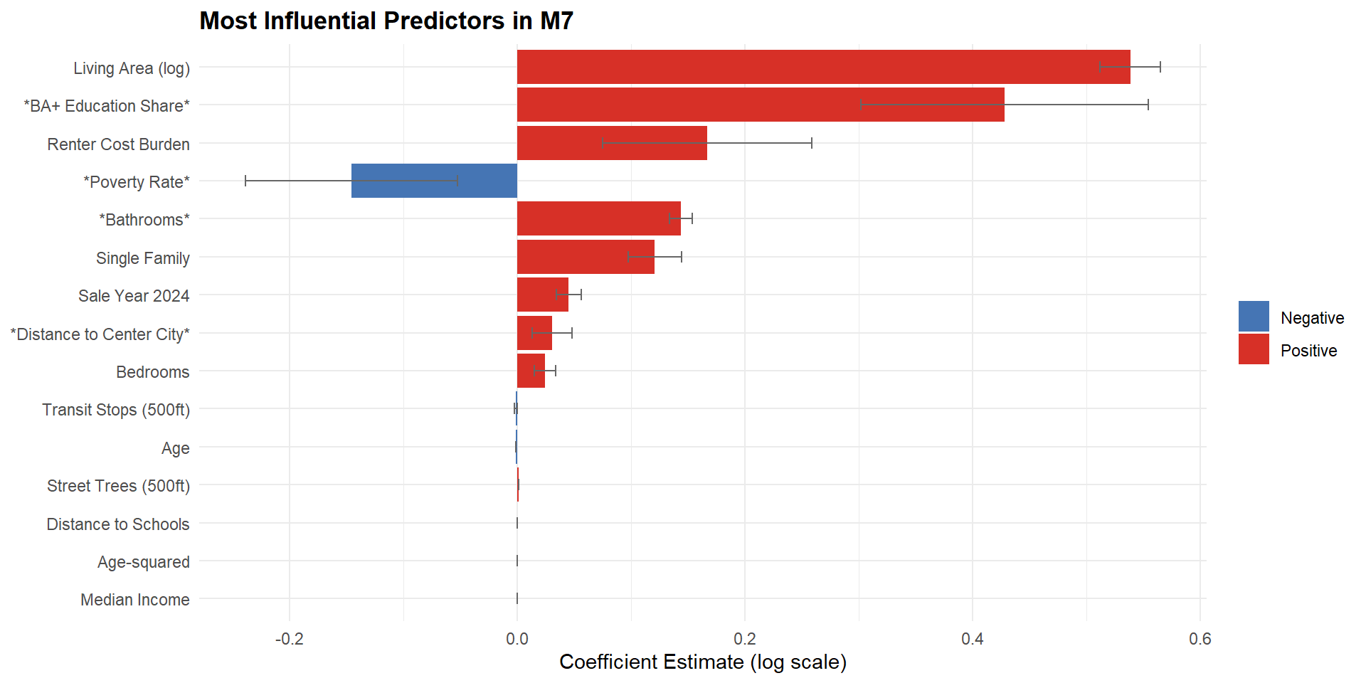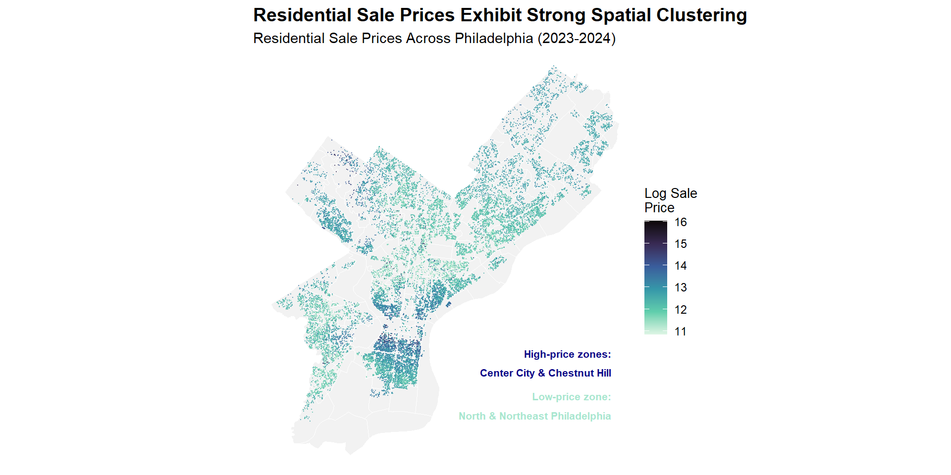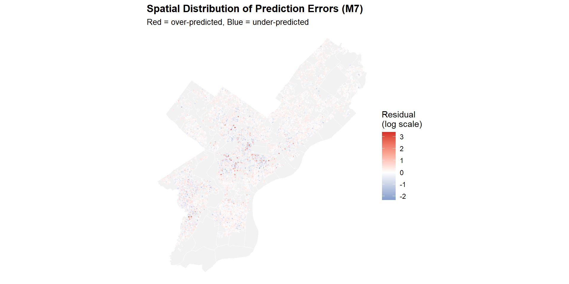 The residuals from m7 are relatively dispersed rather than forming large, continuous clusters, which suggests that the final model captures much of the broad spatial structure in Philadelphia housing market. At the same time, some localized market variation is still not fully explained.