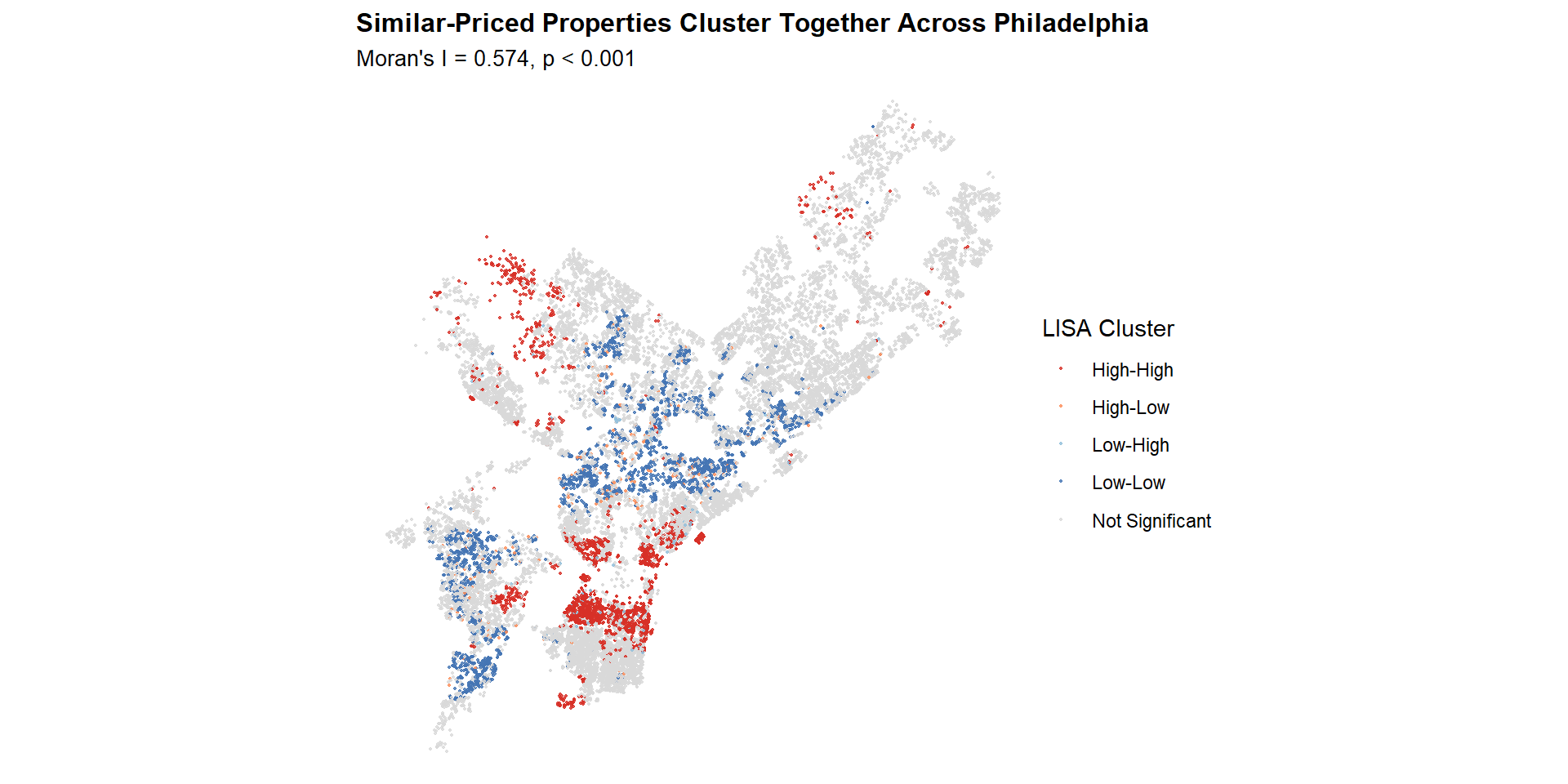 Low-Low clusters dominate North and West Philadelphia.