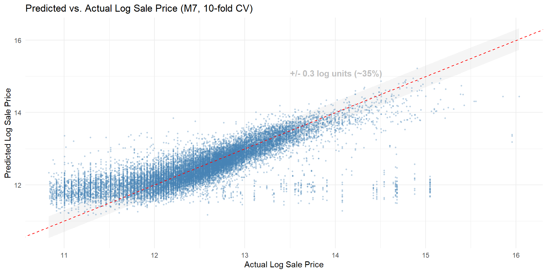 Model Accuracy RMSE = 0.422 (log scale), R-squared = 0.627 (10-fold CV)